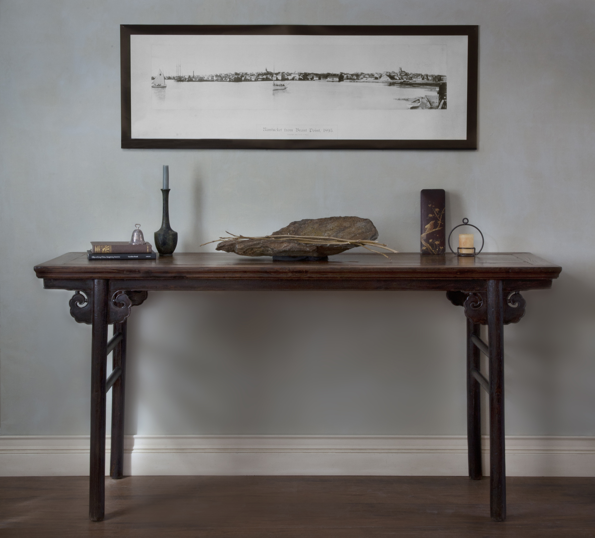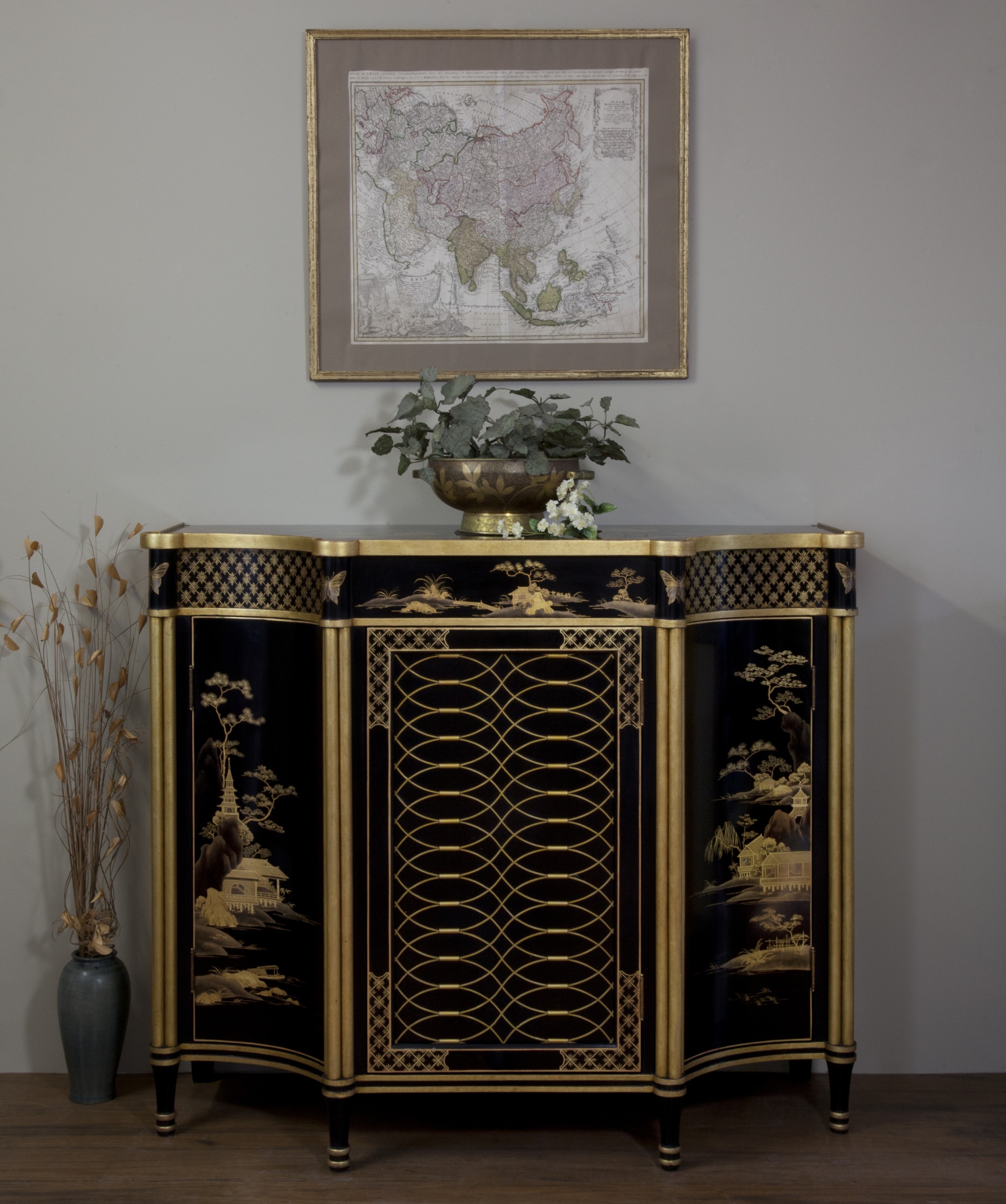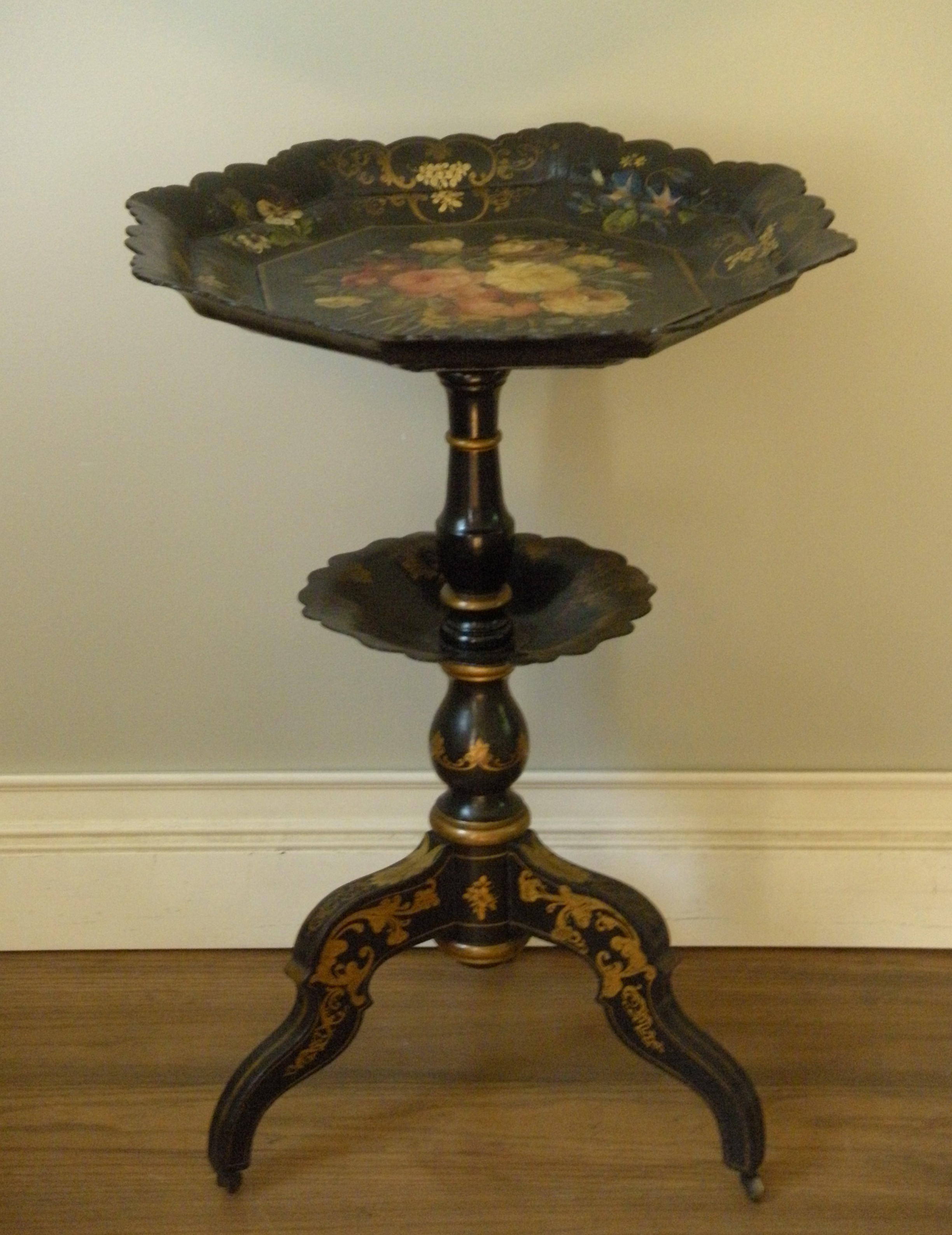 The photo above is of the top of an antique Chinese Canton lacquer table. The table was fully decorated overall, except for the top. I was asked to create something in the appropriate style, with an aged appearance.
