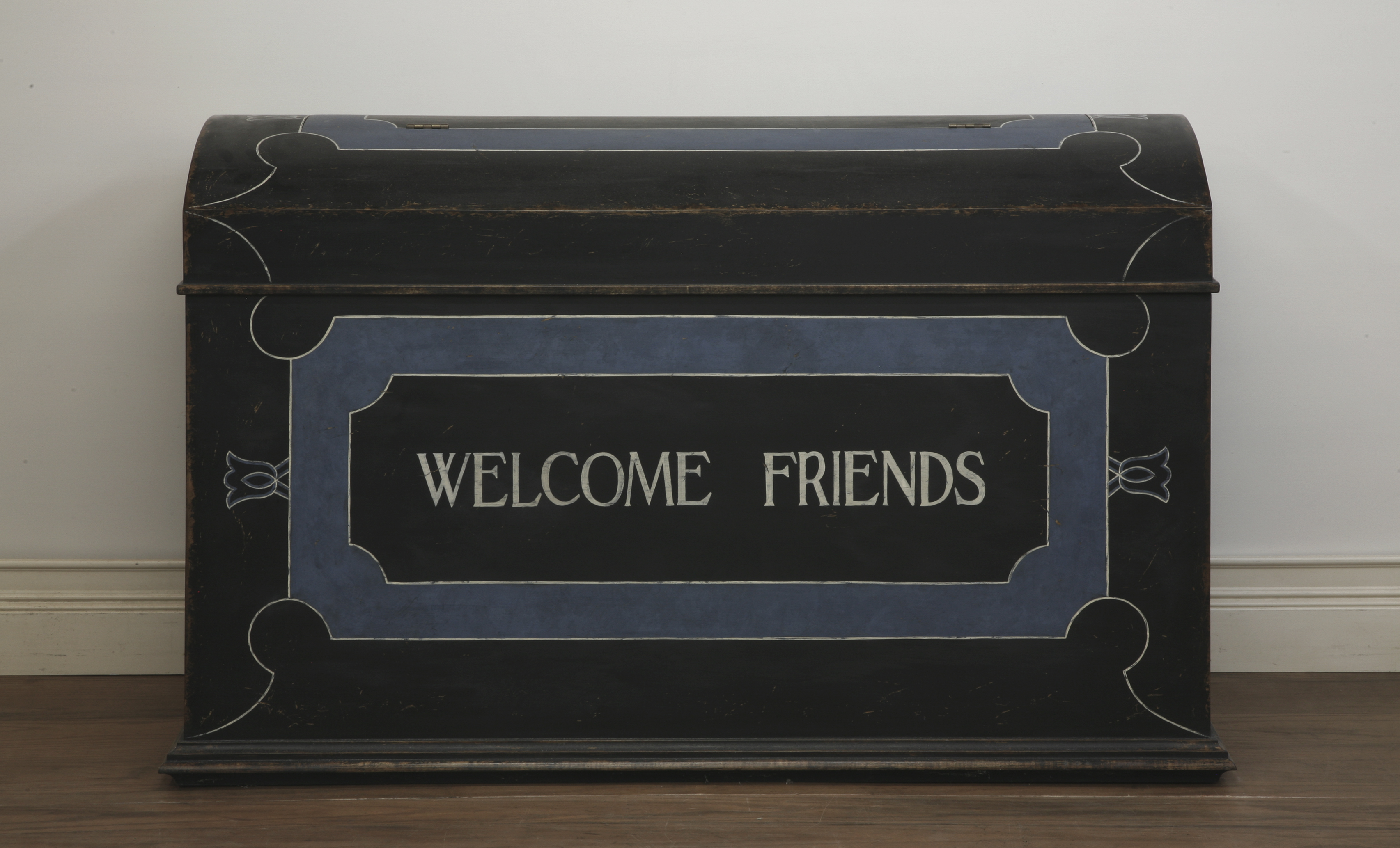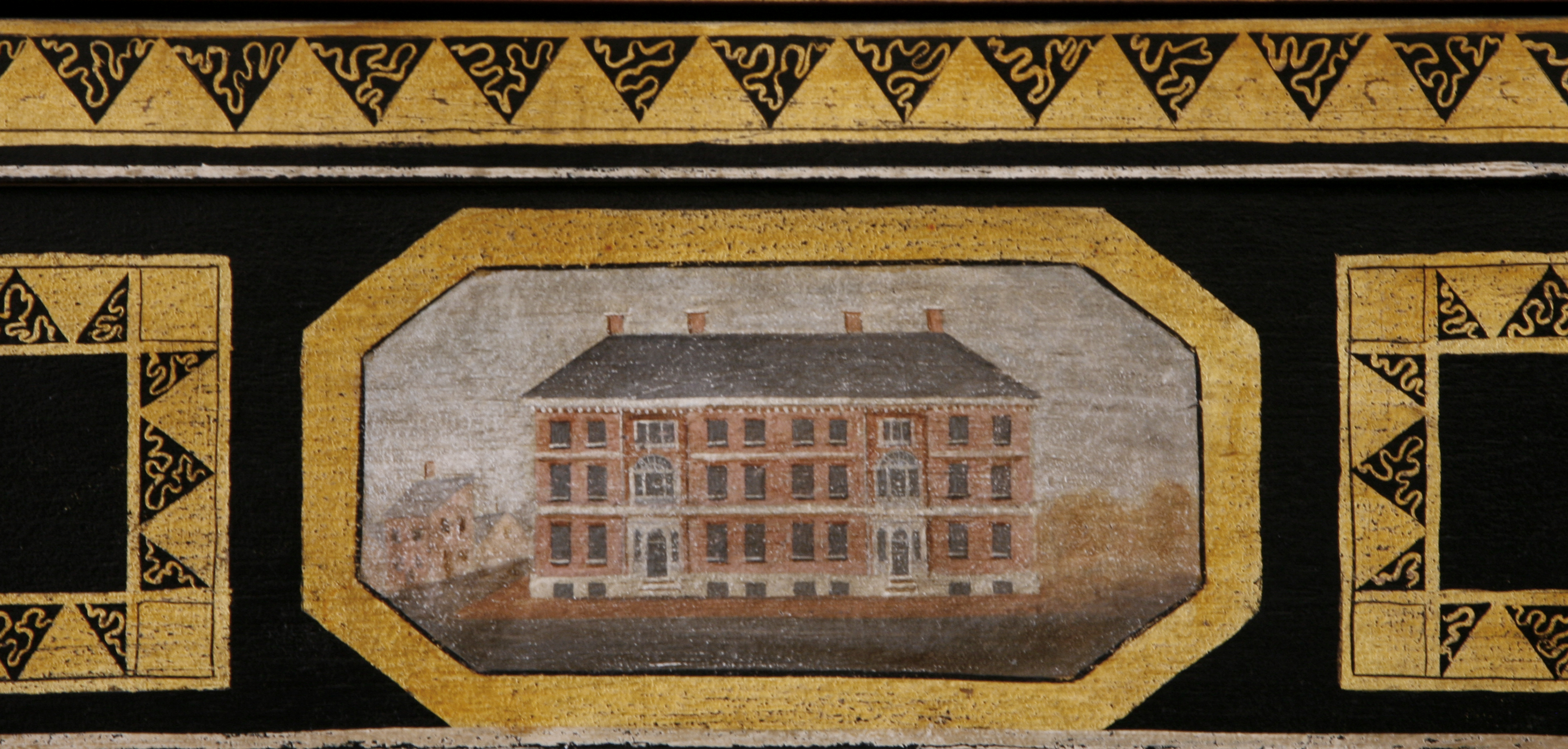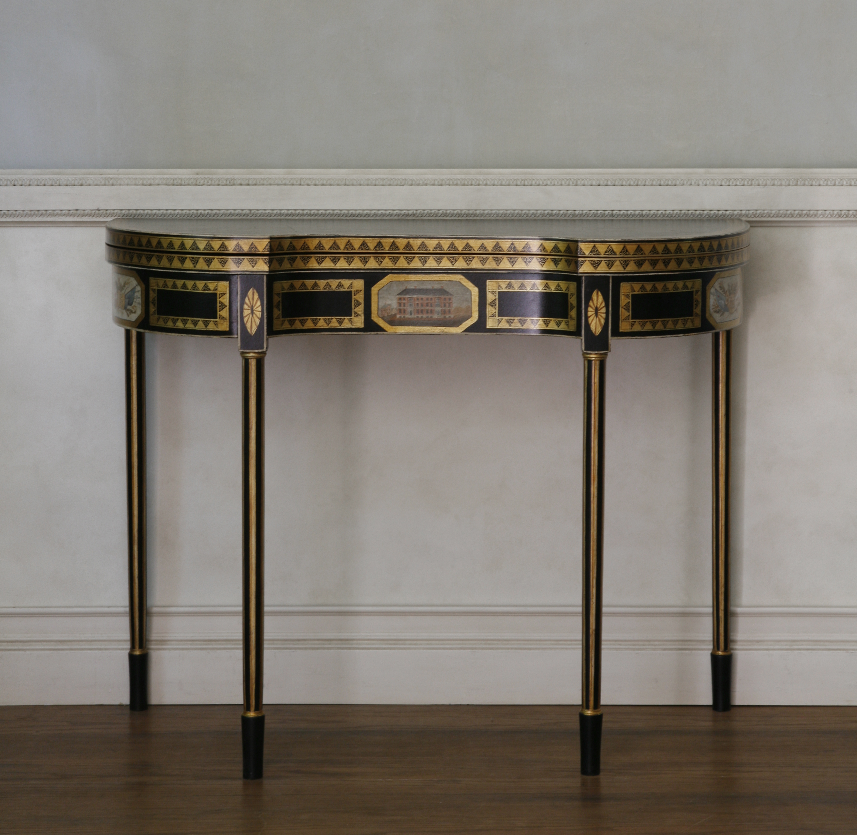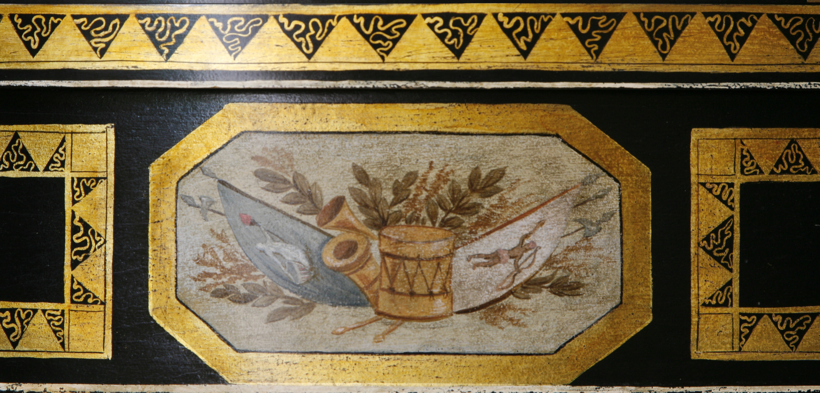 Finally, I painted the new area black, added the gilded decoration, and distressed the restored area to blend it in with the surrounding original surface.